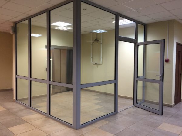 Угловые противопожарные перегородки могут изготавливаться как в полностью остекленном варианте, так и в частично остекленном исполнении. Основное предназначение таких конструкций — это разделение общего помещения на несколько отдельных рабочих зон. При этом преследуется несколько целей:
